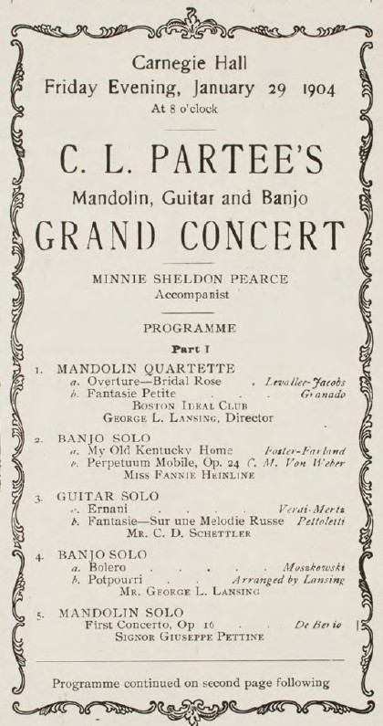 Schettler’s greatest claim to fame is that he was the first guitarist to perform at Carnegie Hall, as a part of a banjo, mandolin and guitar concert (the BMG movement was a popular phenomenon at the time). However, Schettler was the first only by a hair: the guitarist William Foden also performed pieces in the second half of the concert. The ‘grand concert’ was followed by a ‘grand banquet’, lasting from 11.30pm to 5.30am and consisting of twelve courses. It was reported that Schettler travelled specially for the concert from Berlin.9