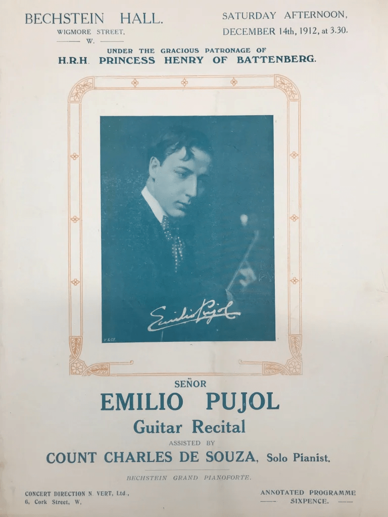 Pujol began studying with Francisco Tárrega in 1902, and was arguably the greatest and most influential proponent of the ‘Tárrega School’ and no-nail playing. In 1912 he was, for example, the first guitarist to play the Bechstein Hall (now the Wigmore Hall, an important chamber music venue), and this novel concert — the classical guitar was very seldom heard in Britain at the time — was reviewed in a number of British publication. The Musical Standard wrote that,